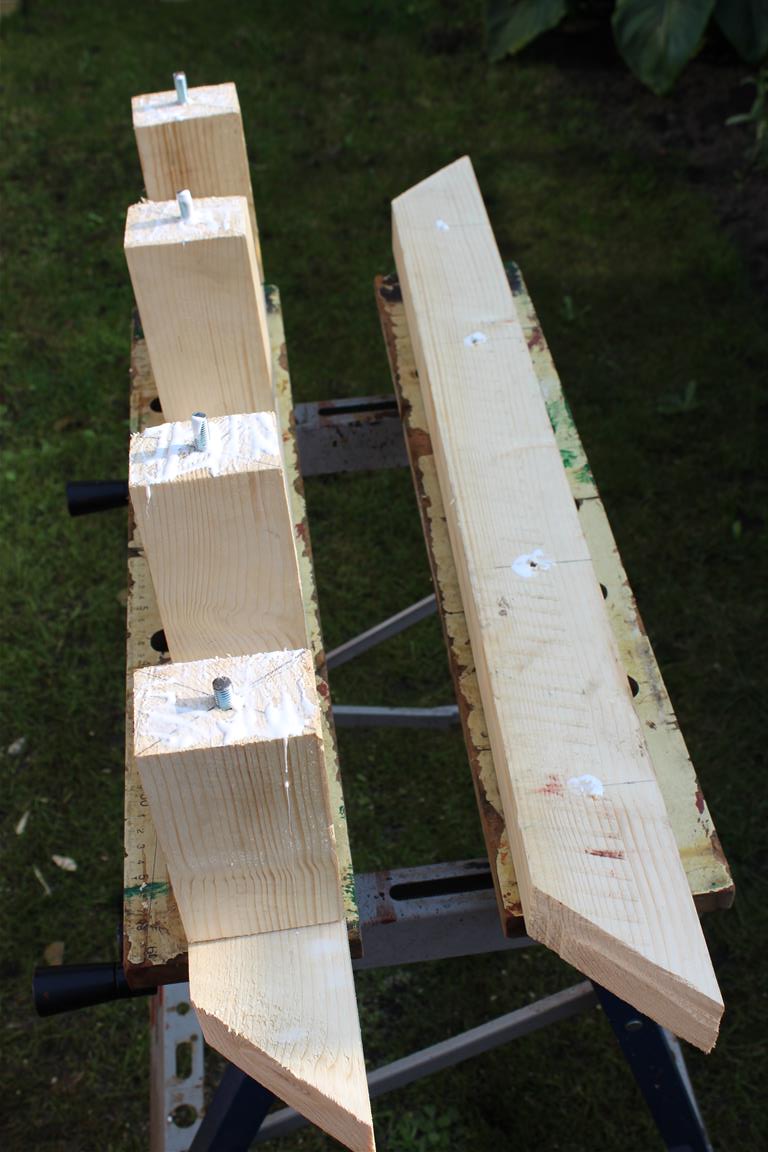 I cut two identical outer pieces and then joined these together with four smaller pieces of wood. I used some threaded bar as dowels to hold it all together, as you can see above.